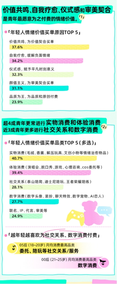 報告指出,青年情緒消費已形成以實物、體驗、社交關係和數位內容為主的多層結構。 其中,實物與體驗類消費最具普遍性,但社交關係和數位消費的情緒溢價更高。 從數據來看,約三分之一的青年通過消費來「自我療癒」,三分之一通過儀式感維繫生活秩序,另有近四成青年願為「價值共鳴」付費。