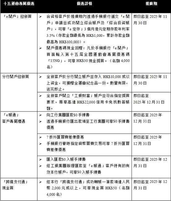 以下為中國工商銀行(亞洲)十五運會專屬優惠